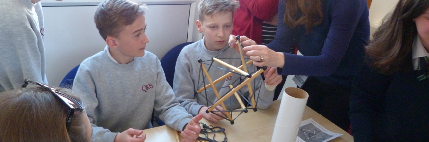 In the last session, the pupils built tensegrity structures. These are made from wooden rods and elastic bands and keep their shapes due to the tension in the bands. They have applications to biomechanics and even space science, as they allow scientists to build equipment that folds flat for launch but assembles itself into a given 3D shape at its destination.